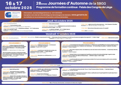 Les 16 et 17 octobre 2025 se tiendront au Palais des Congrès de Liège les 28è Journées d'Automne de la Société Belge de Gériatrie et de Gérontologie, la SBGG.