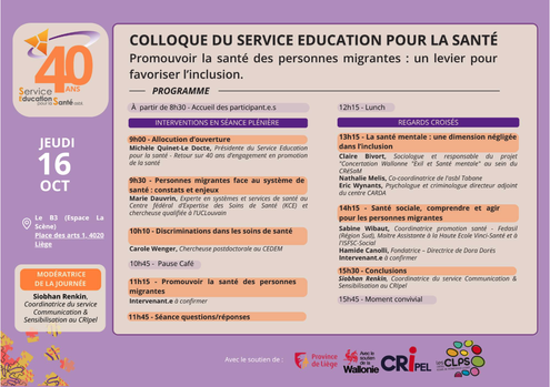 Le jeudi 16 octobre 2025, l'asbl Service Éducation pour la Santé organise le colloque Promouvoir la santé des personnes migrantes : un levier pour favoriser l'inclusion.